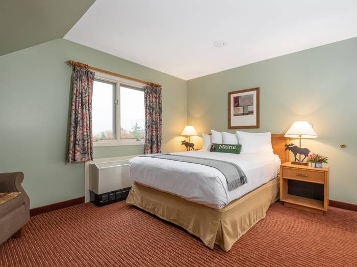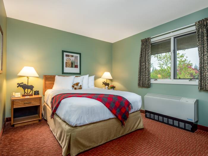 One-Bedroom Suites feature separate bedrooms and living spaces. All units offer a full living area, kitchen, one bath, and an outdoor deck. Adjoining lockout room available with select units. Bedrooms offer a queen or king bed, with an additional queen-sized murphy bed or sleeper sofa available either in the bedroom or on the living space. Murphy beds pull down from the wall and fold up out of sight when not in use. Mattresses rest on platforms.