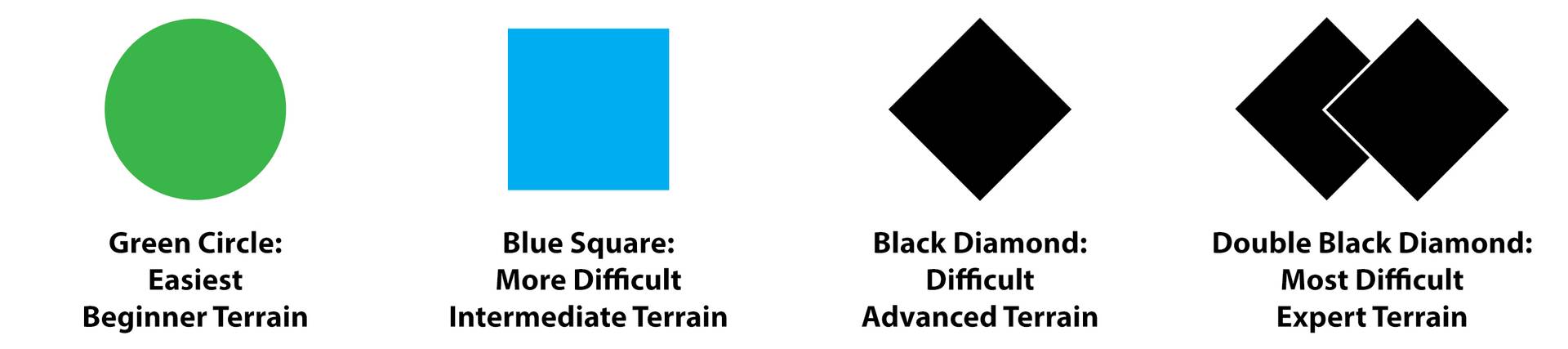 Blue Square: Intermediate terrain. These trails have steeper pitches and may present more challenging snow than our green circle trails.