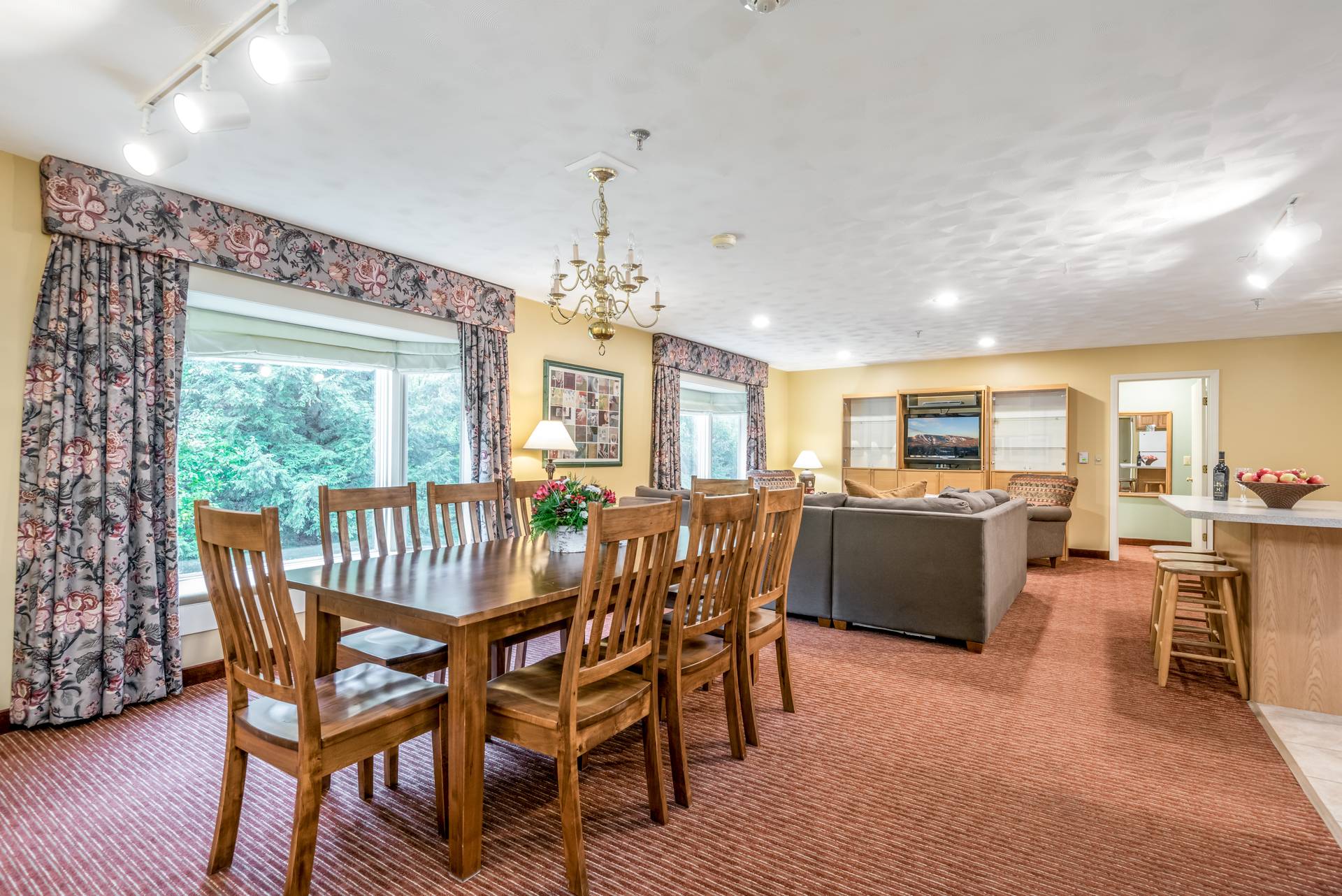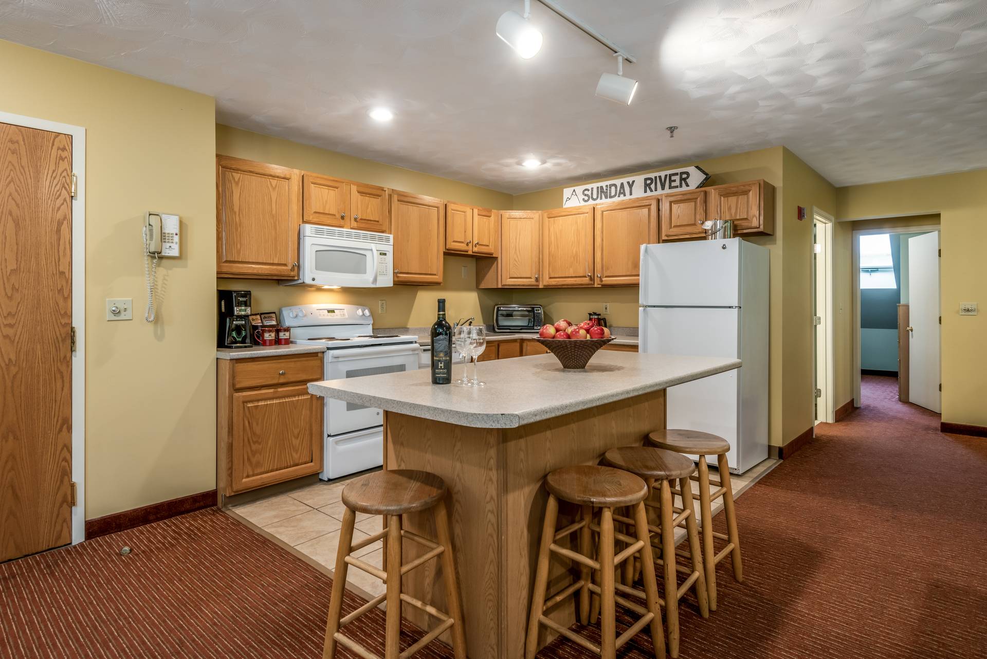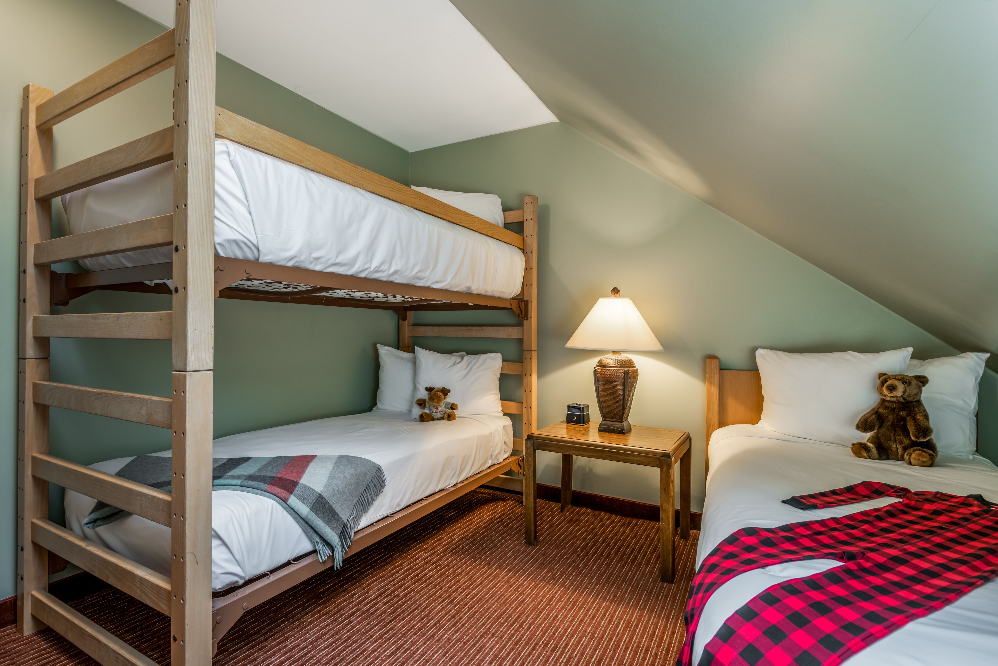 A Three-Bedroom Suite has three separate bedrooms featuring a queen in the first bedroom, a king in the second, and a twin and bunk in the third bedroom, plus a full living area with a queen-sized sleeper sofa and kitchen facilities. The unit features two full bathrooms. This unit is accessible only by stairs.