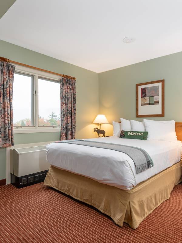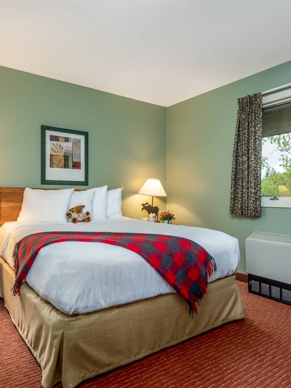 One-Bedroom Suites feature separate bedrooms and living spaces. All units offer a full living area, kitchen, one bath, and an outdoor deck. Adjoining lockout room available with select units. Bedrooms offer a queen or king bed, with an additional queen-sized murphy bed or sleeper sofa available either in the bedroom or on the living space. Murphy beds pull down from the wall and fold up out of sight when not in use. Mattresses rest on platforms.