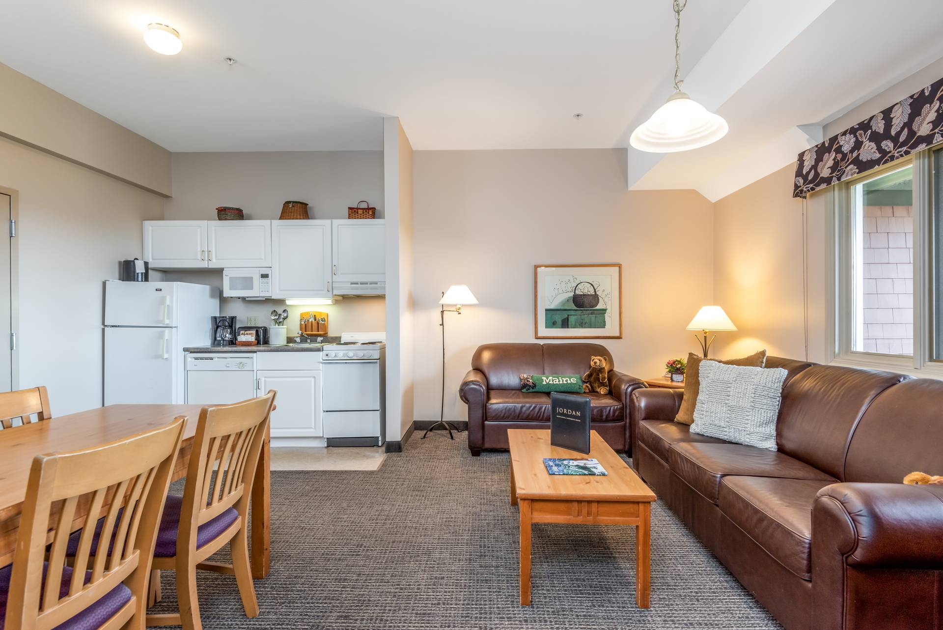 One-Bedroom Suites offer either a queen or king bed, with an additional queen-sized Murphy bed or queen-sized sofa bed available either in the bedroom or in the living space. The bedroom is separate from the living space. Murphy beds pull down from the wall and fold up out of sight when not in use. Mattresses rest on platforms. All units offer a full living area, kitchen, and one bath. Adjoining lockout room available with select units.