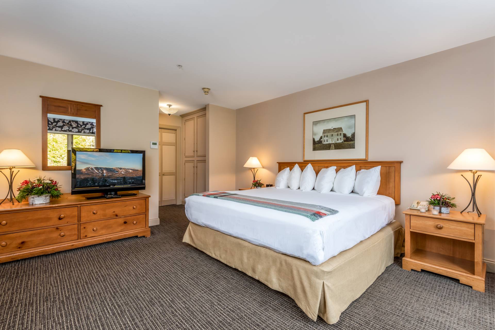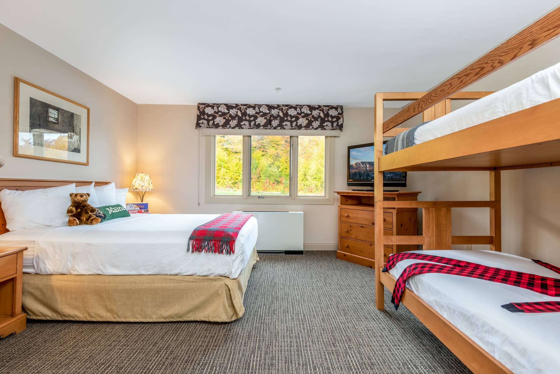 Two-Bedroom Suites feature two bedrooms. Units typically have a downstairs bedroom with varied bedding configurations and an upstairs loft with a king-sized bed. Some units offer an additional half bath in the loft. All units offer a full living area, kitchen, bathroom, and an outdoor deck.