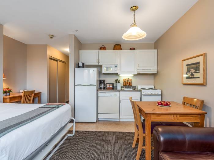 Studio Superiors offer a queen-sized Murphy Bed and kitchenette. Murphy beds pull down from the wall and fold up out of sight when not in use. Mattresses rest on platforms. Select units also offer an outdoor deck, adjoining lockout room, or handicap accessibility.
