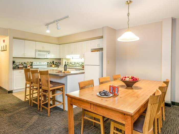 Each Three-Bedroom Suites is unique. All offer three separate bedrooms, two to three bathrooms, living areas, and kitchen facilities, and outdoor decks. Select units offer gas fireplaces, laundry, or sauna. Availability is limited and early booking recommended.