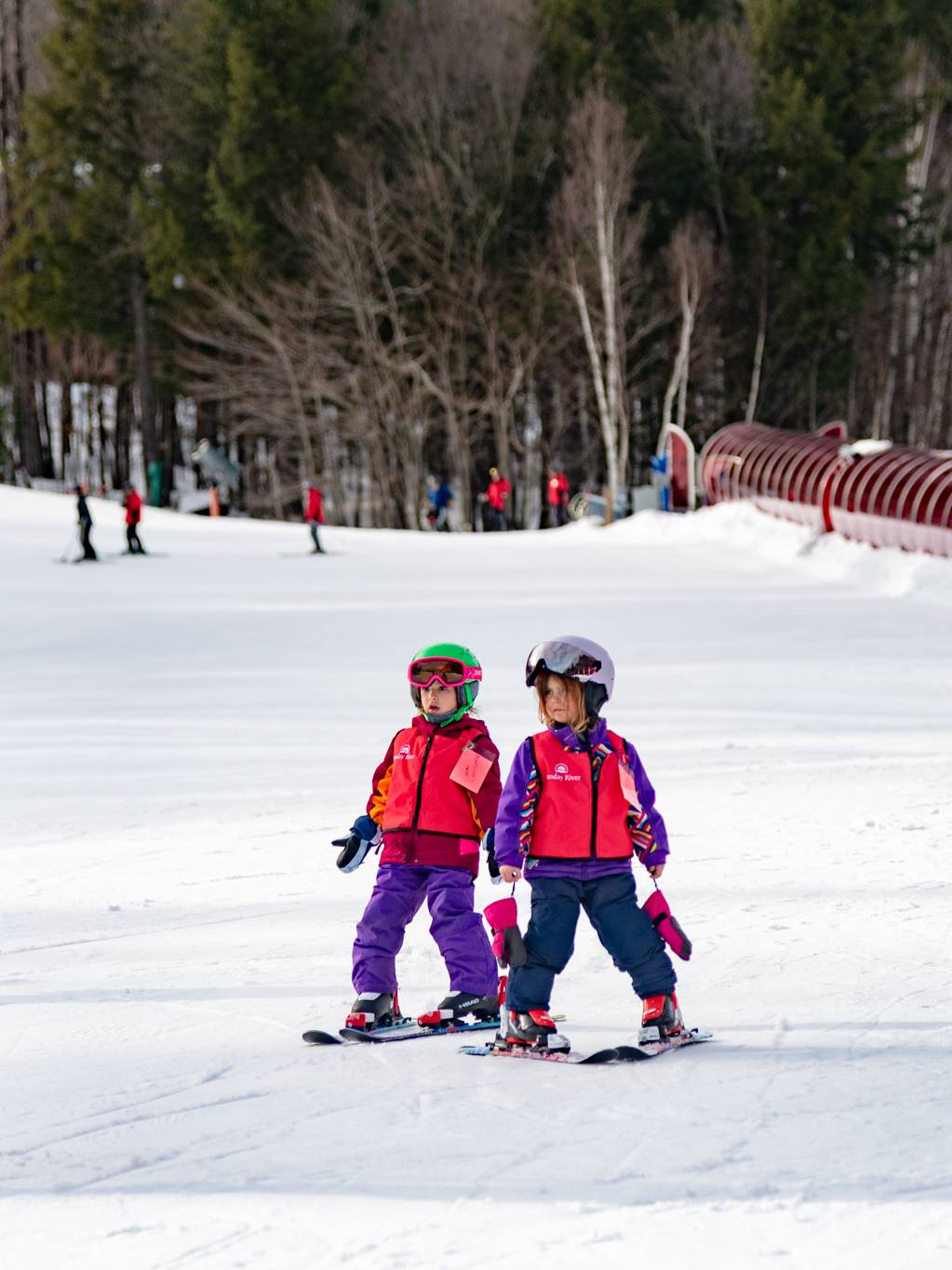 Lessons meet slopeside at South Ridge near the surface carpets. Staff will be located at each meeting point to help direct you toward your group. Adult First Time Experience lessons will collect their equipment in the Merrill Brook building, directly next to the lesson meet-up area.