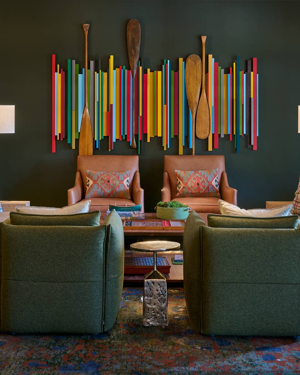 The Jordan lobby’s transformation blends natural wood accents, rich textures, and a spacious layout that invites guests to relax and soak in the ambiance, mirroring the rugged charm of Maine's mountain landscapes.